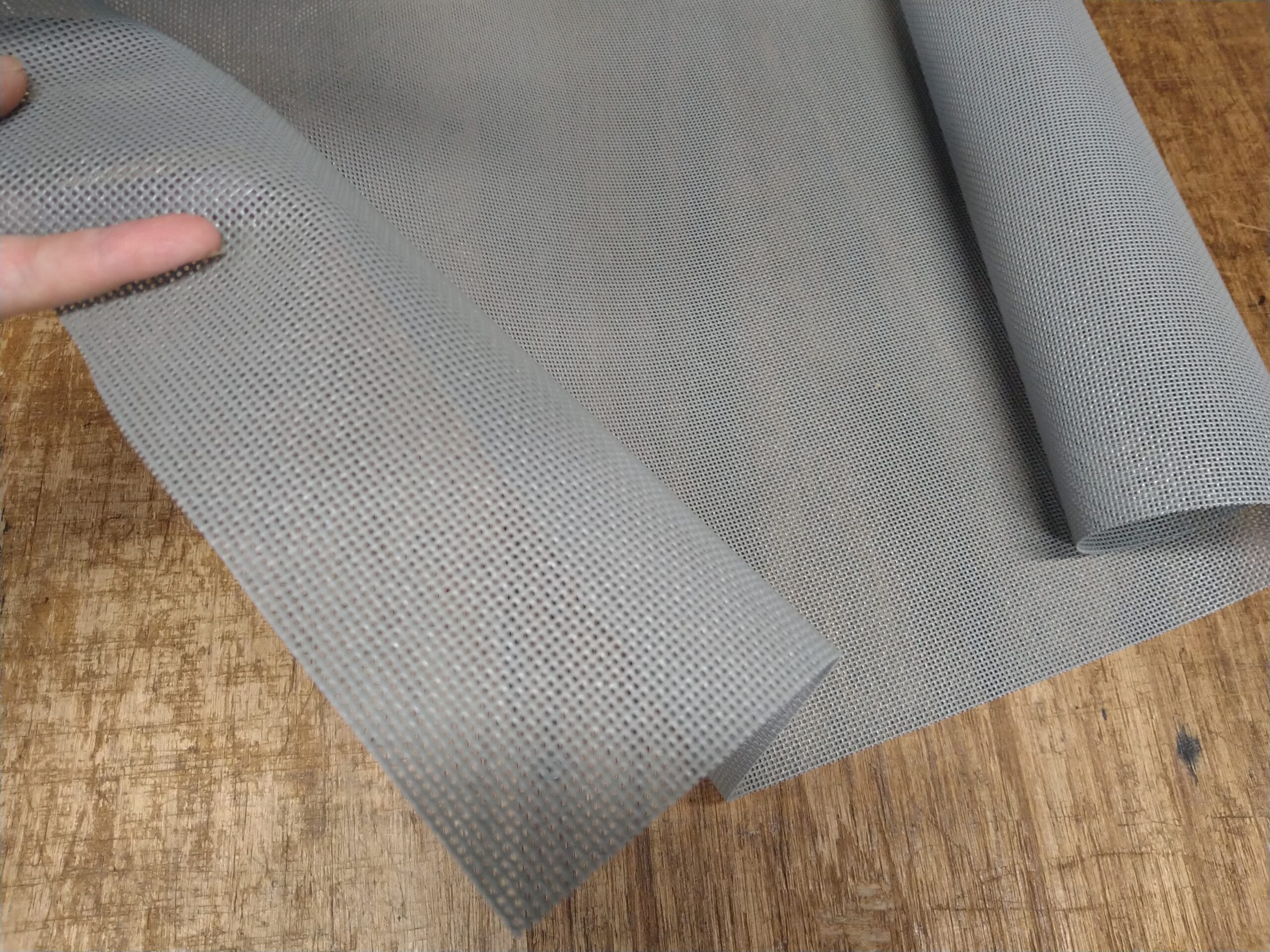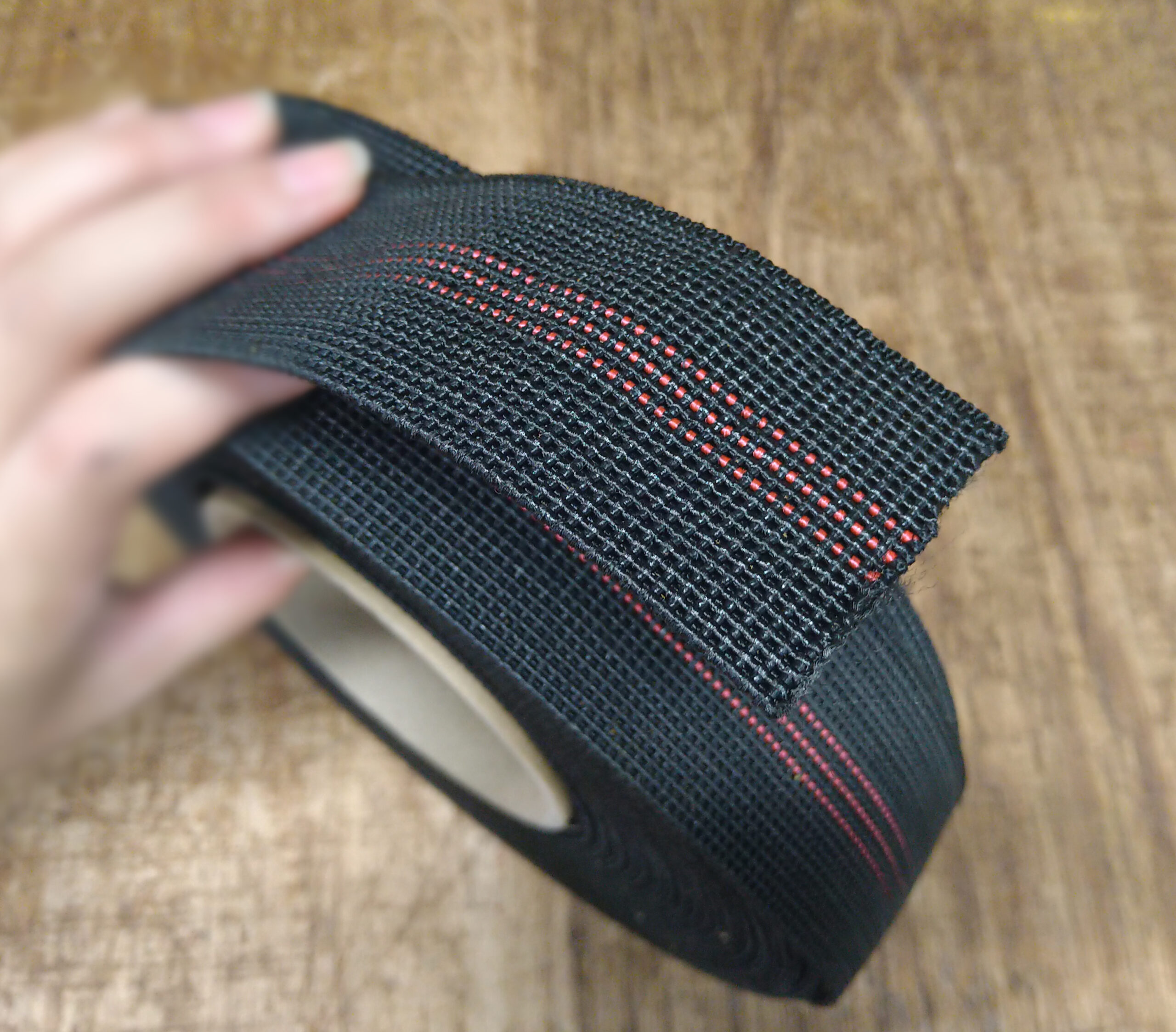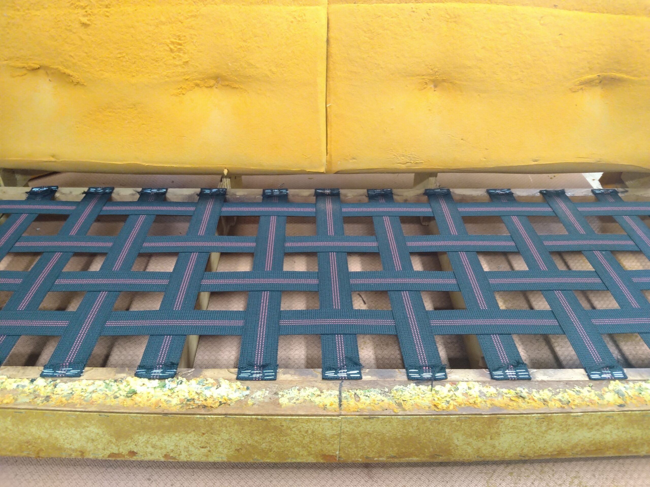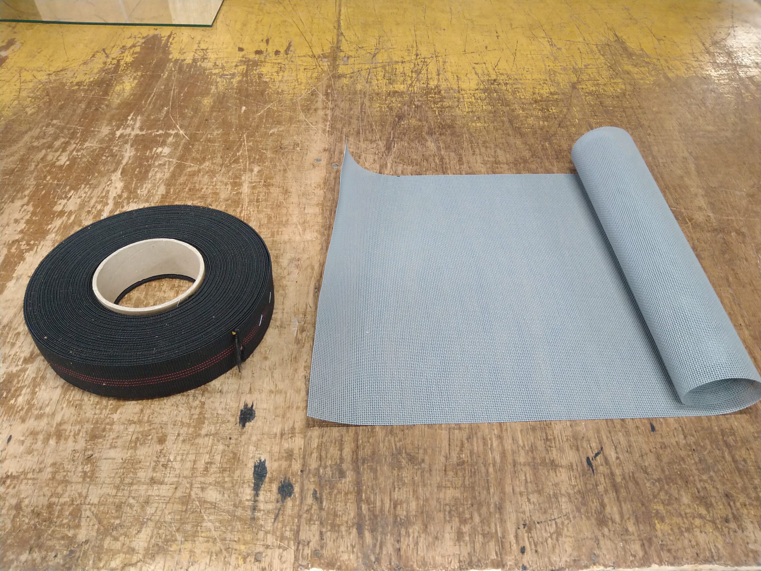 その場合、バネは取り除き、新しいベースを木枠に張っていきます。使われるのはウェービングベルトと呼ばれるゴムを編み込んだベルト(写真左)とパワフルメッシュです。(写真右)