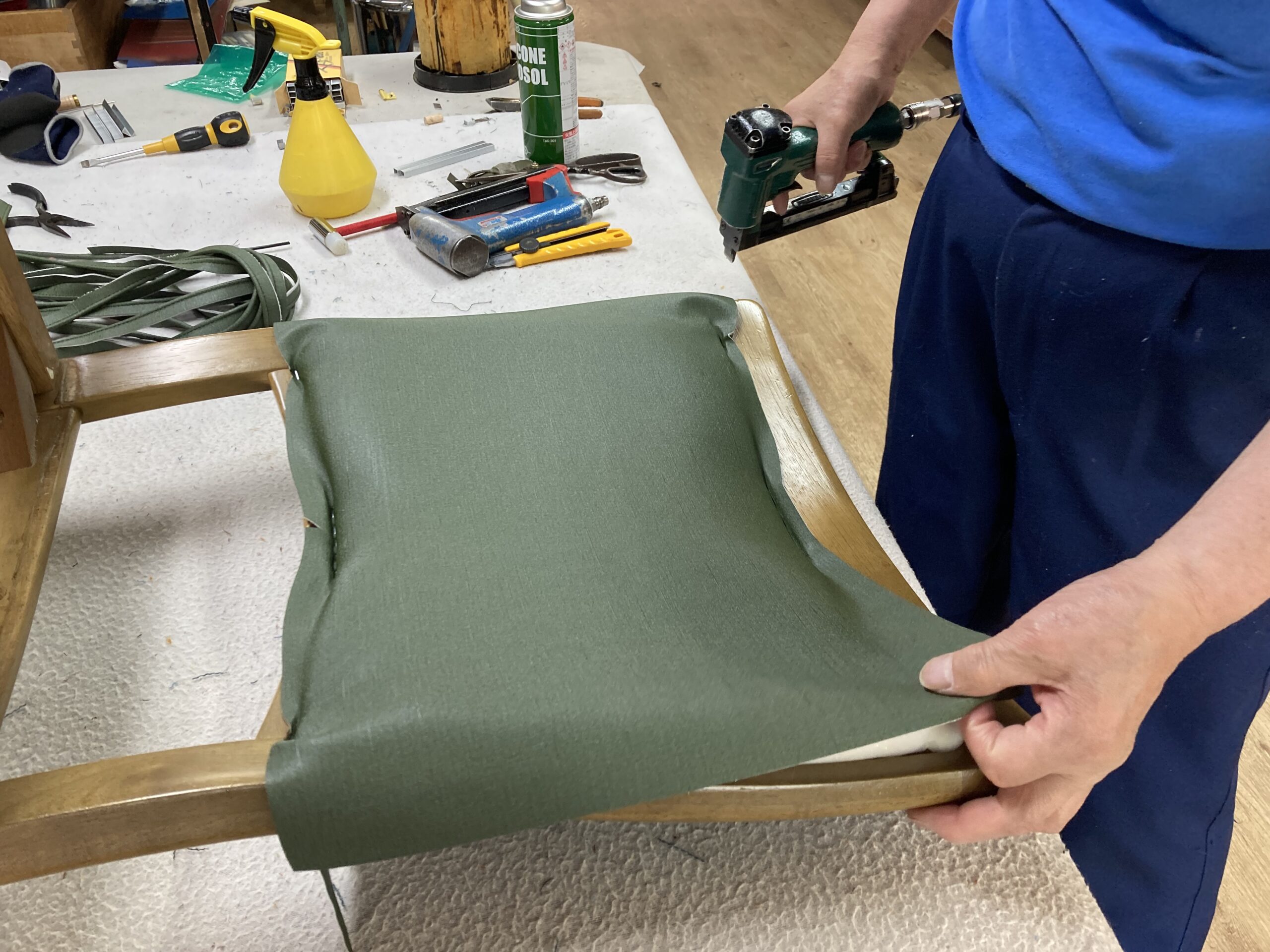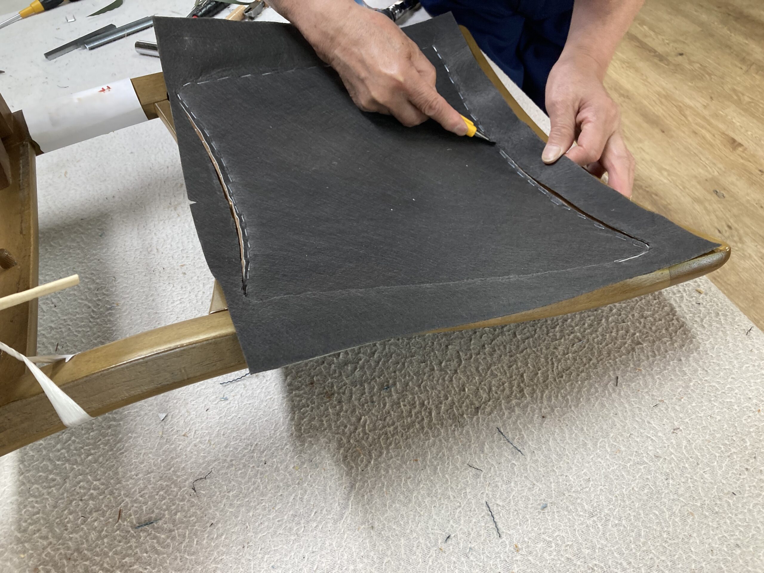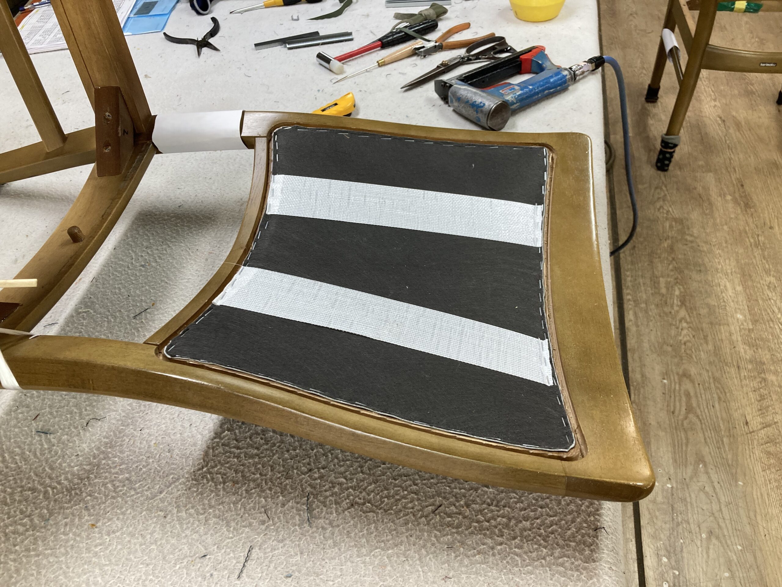 まず張地を打つのですが、張地だけだと背中の荷重に耐えられないので不織布も張ります。
