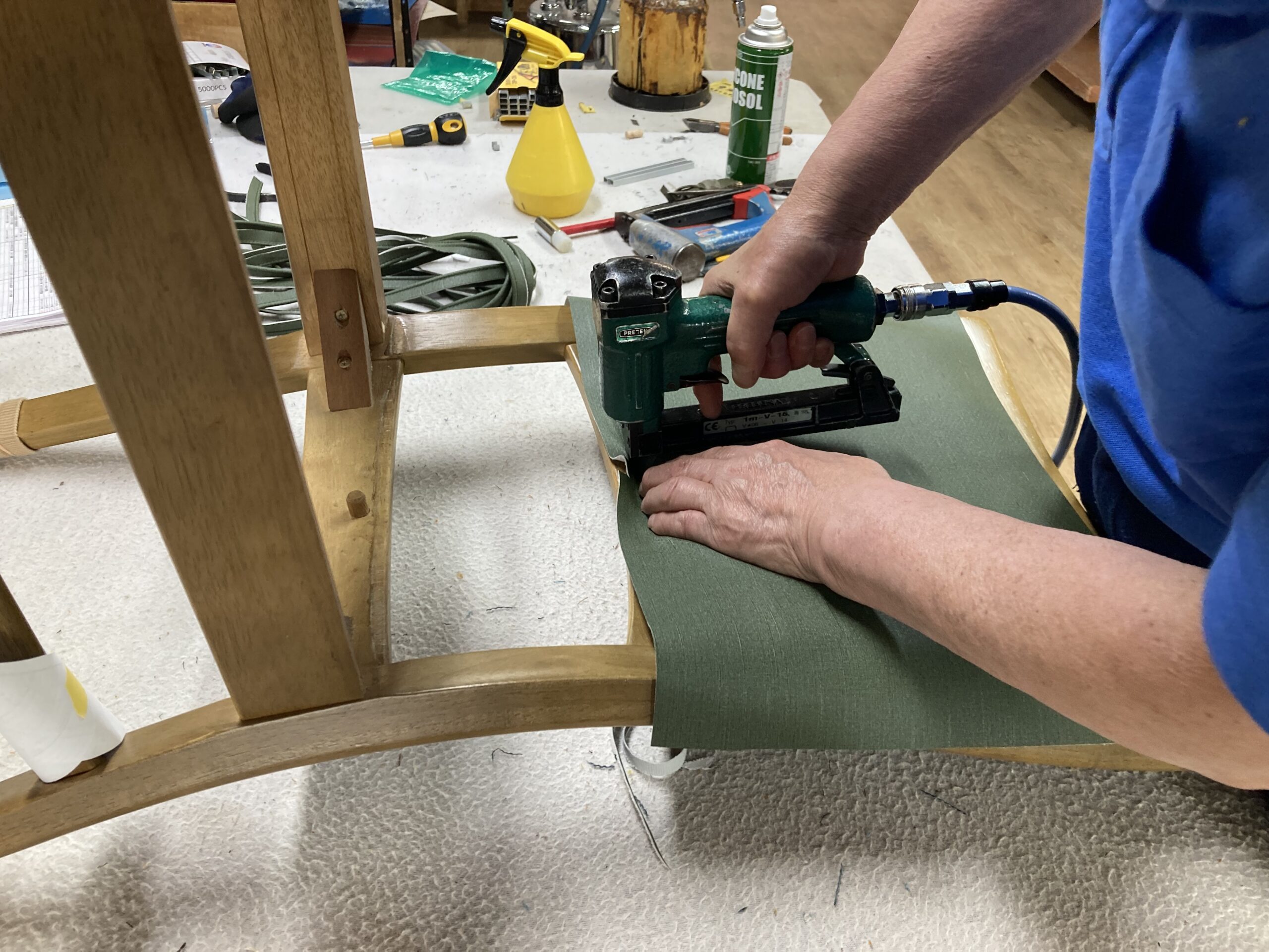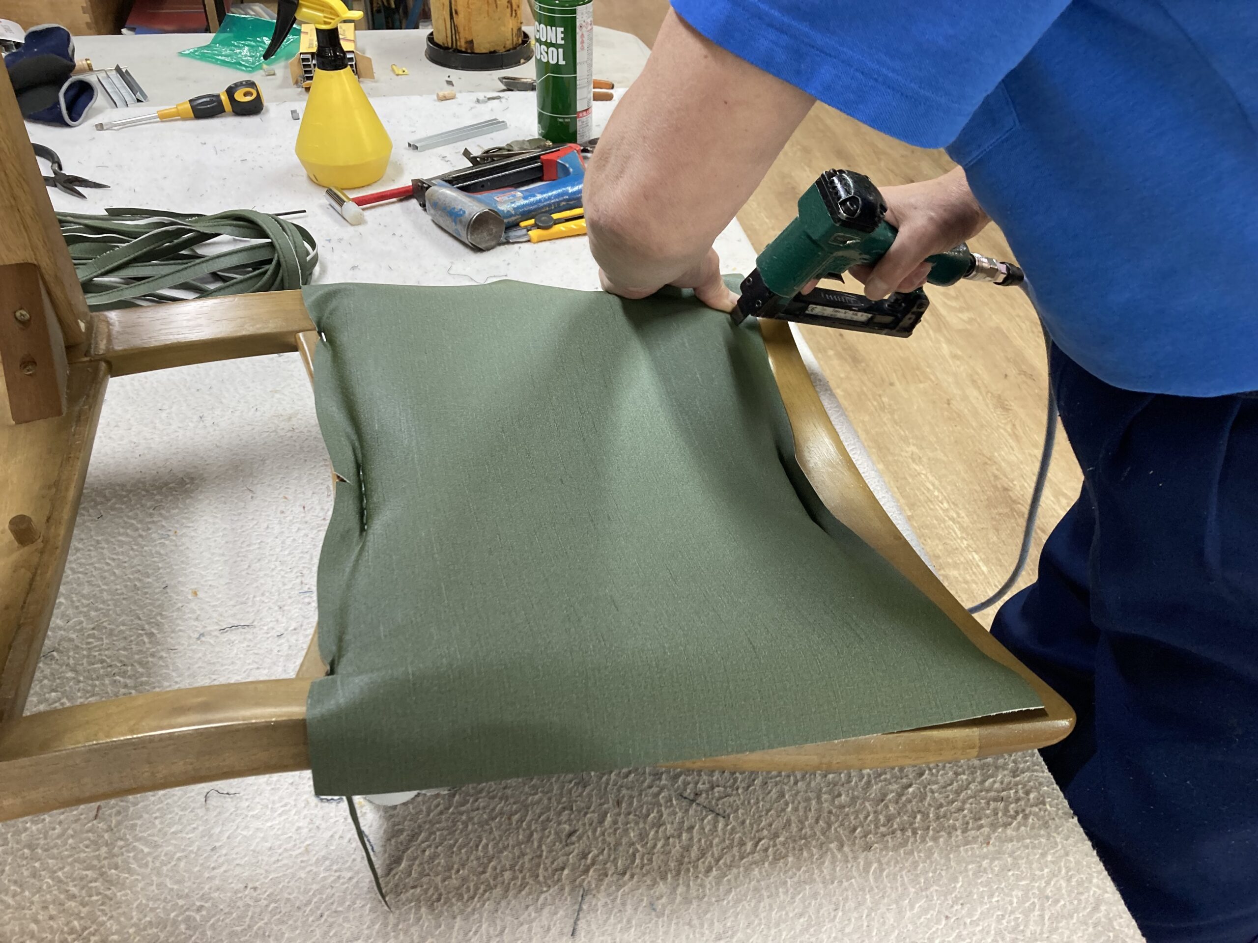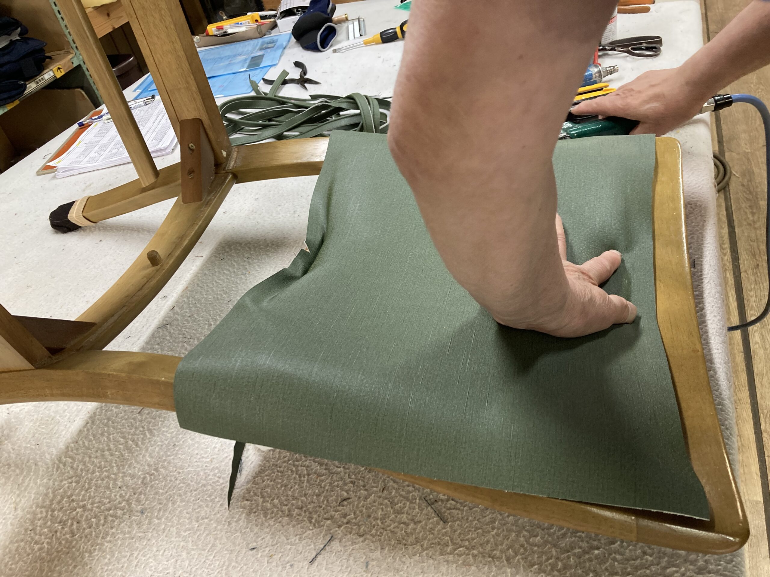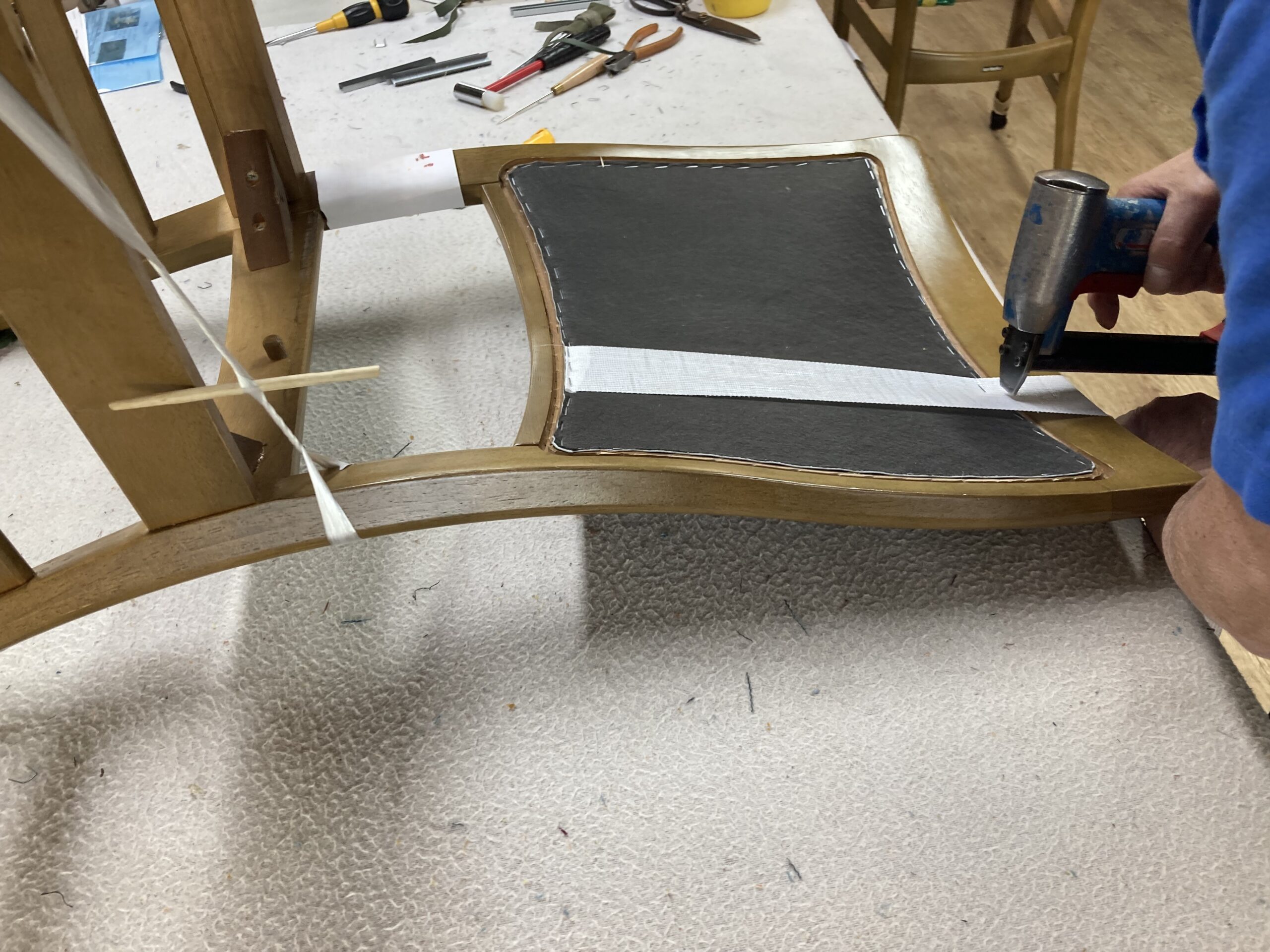 まず張地を打つのですが、張地だけだと背中の荷重に耐えられないので不織布も張ります。