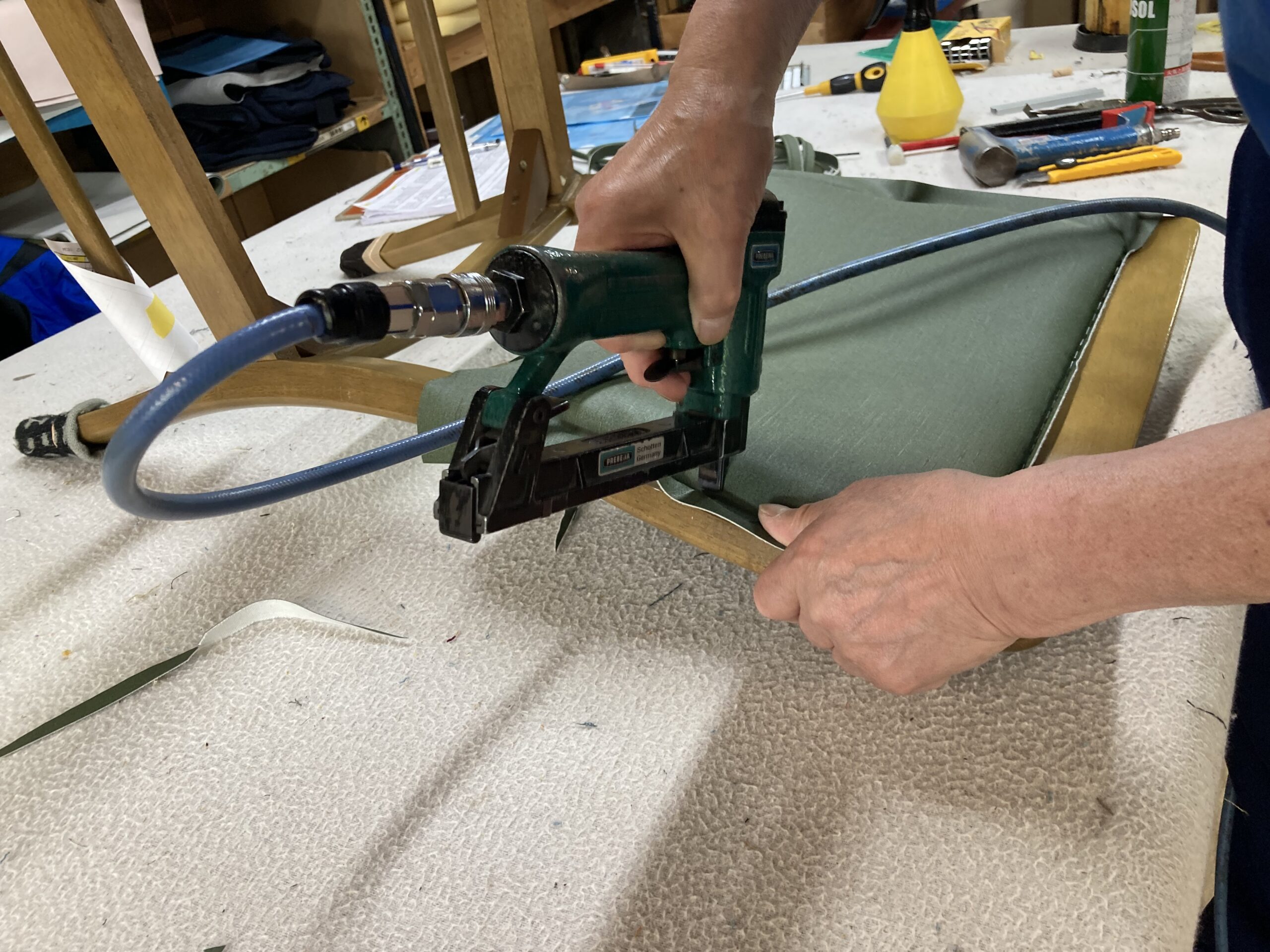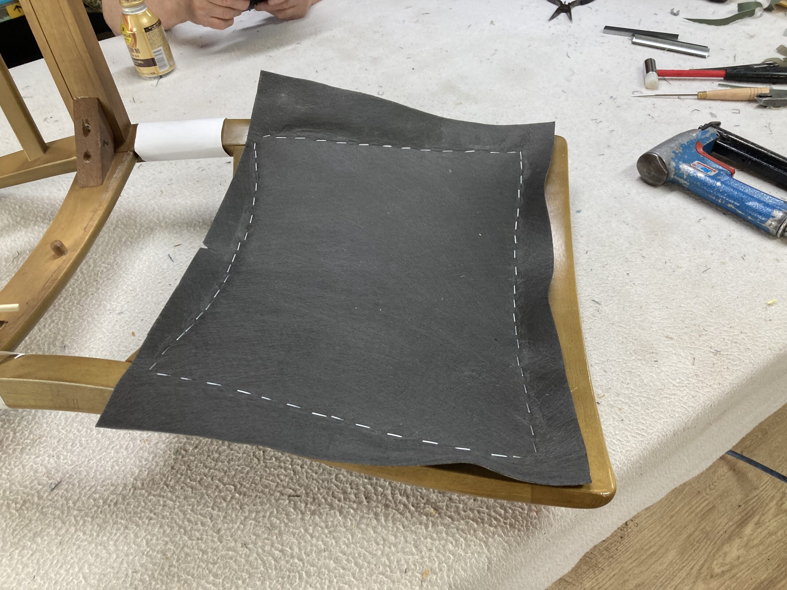 フレームにタッカー針を打つのですが、同じ位置に張地と不織布の2枚張ることになるのであらかじめ2枚を重ねて接着しておき、1枚にしてしまいます。