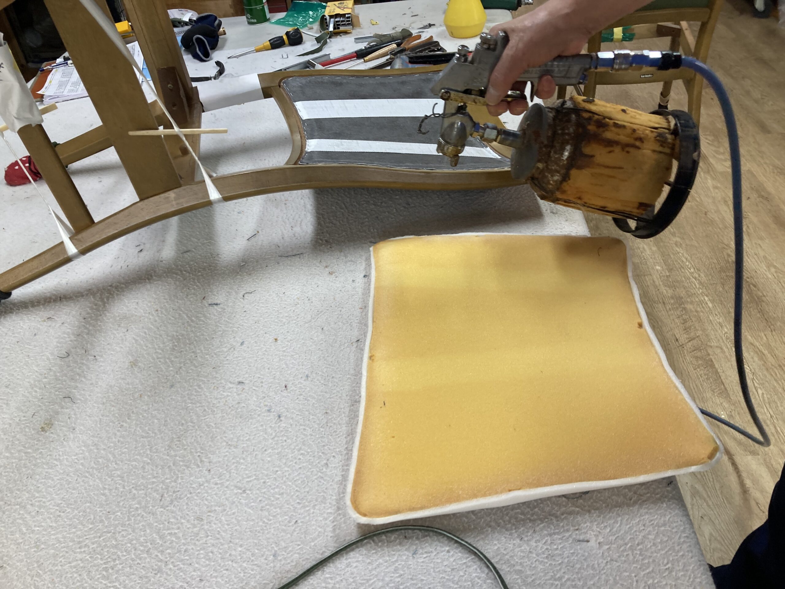 次にウレタンに接着剤を吹いて付けます。