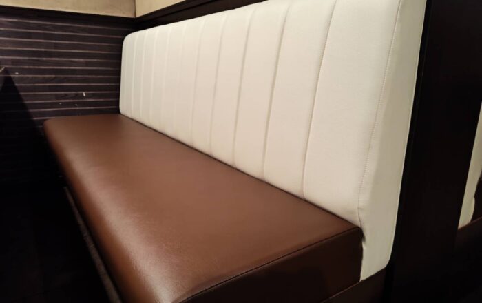 みなさん、こんにちは。イスの着せかえ屋さんSOHOのヤマシロです。今回は、岡崎市にある「鉄板焼き ZIPANG」様のBOXソファ張替事例のご紹介です。元々はソフトレザーが張ってあるBOXソファ。使用していく中で表皮が加水分解を起こしてしまい、ポロポロ表皮が取れている状態でした。今回は、ハードレザーで着せかえます。選んだのは生地はS