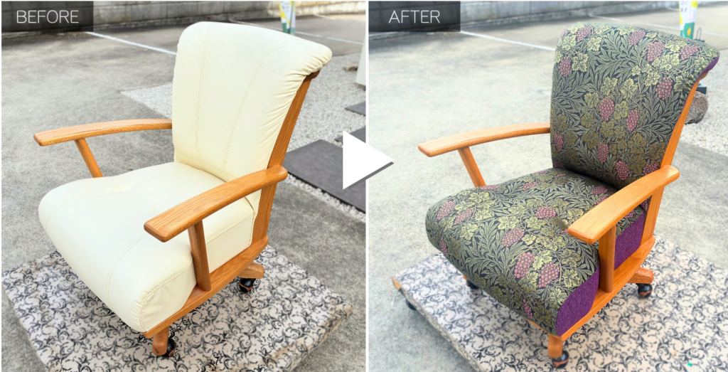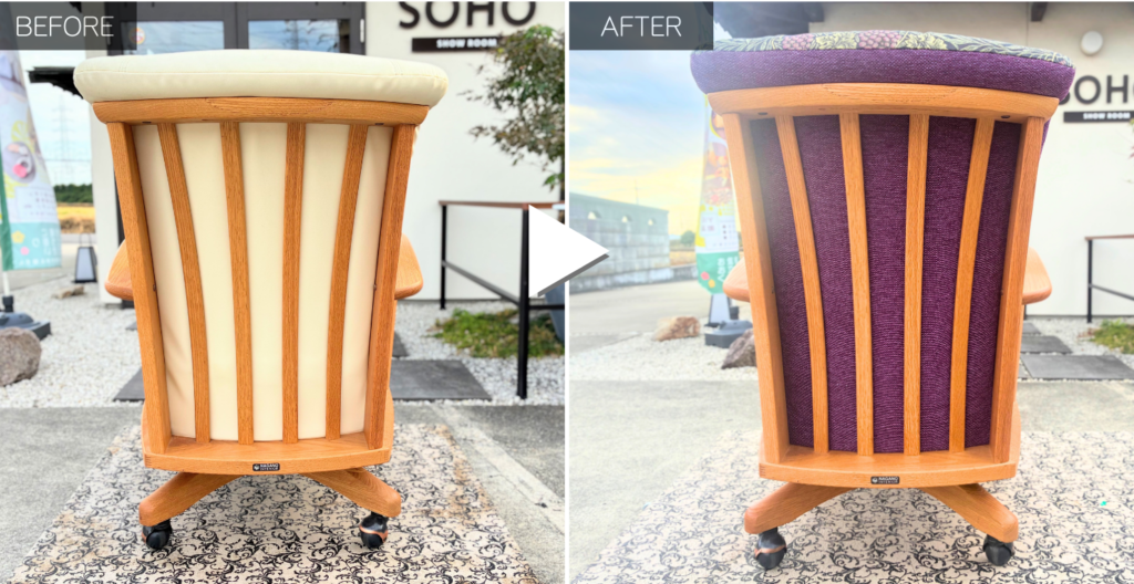 今回、アップチェアをお選びいただいたことで、お使いの椅子を張替え+修理をするよりも、コストを抑えたご提案が可能になりました。